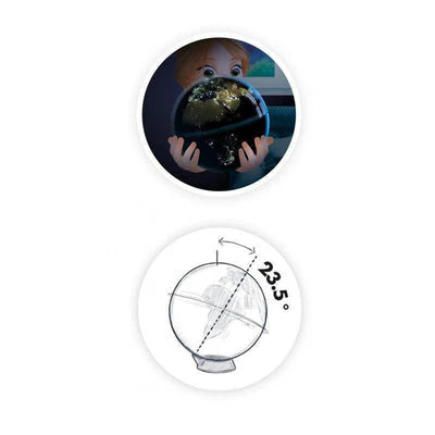 גלו את כדור הארץ ביום ובליל! במהלך היום החוקרים הצעירים יוכלו לגלות את היבשות כאילו הם מביטים בו מהחלל. בליל, כאשר מחשיך, הערים הגדולות מוארות! הרימו את הגלובוס וראו אותו ממשיך להסתובב בידכם!