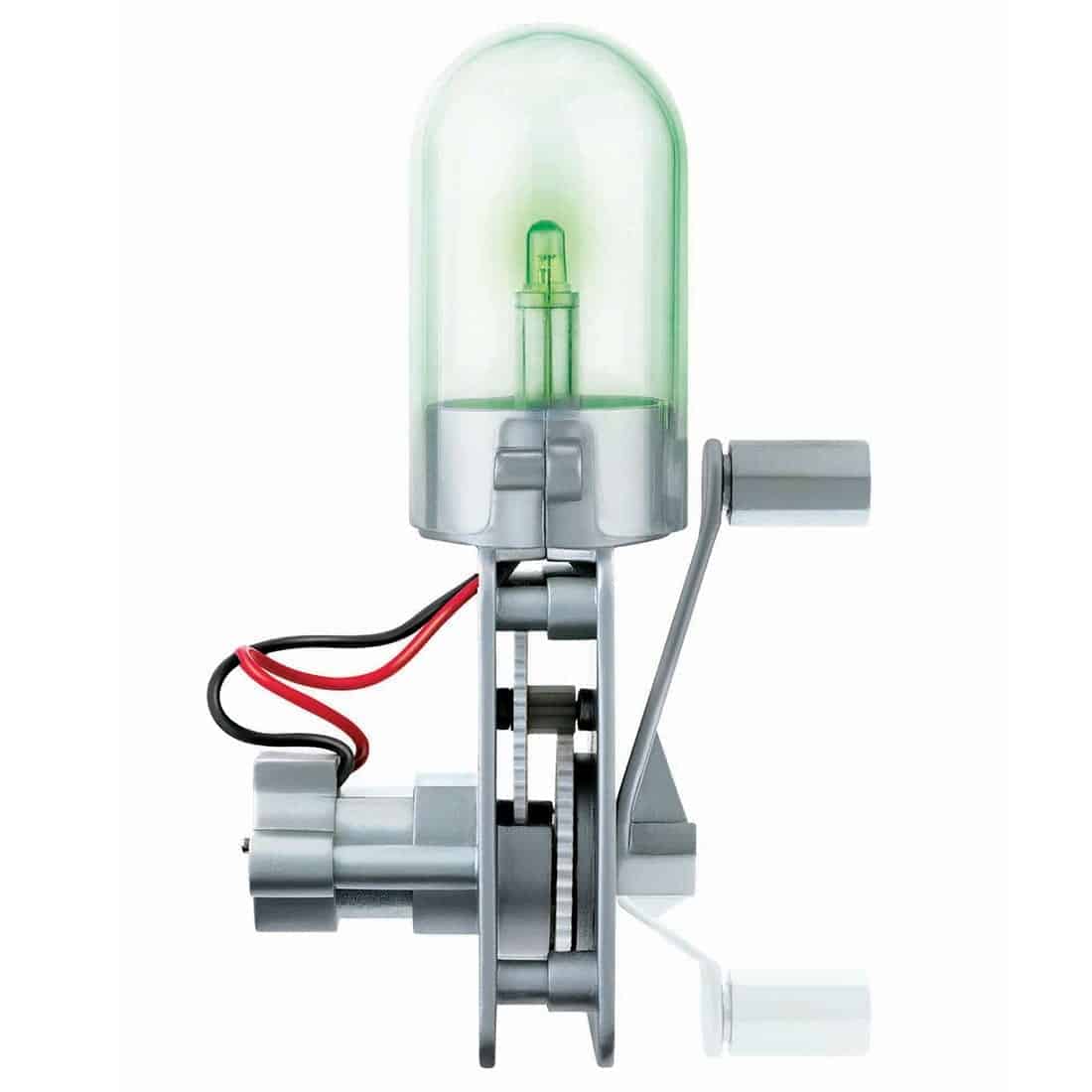 ערכת “מדע ירוק” שבה הילדים מרכיבים בעצמם פנס כיס הפועל ללא סוללות – רק בכוח היד! הערכה מכילה דינמו, נורה, מנוע וידית מנואלה. לאחר ההרכבה, מספיק לסובב את הידית וסליל הדינמו מייצר חשמל שמדליק את הנורה שבפנס. הילדים לומדים בצורה חווייתית כיצד תנועה (אנרגיה מכנית) יכולה להפוך לחשמל (אנרגיה חשמלית) וכך מאירים את הדרך. זו פעילות הממחישה עקרונות פיזיקליים של המרת אנרגיה ושל קיימות (אור ללא סוללות), וגם מספקת פריט שימושי – פנס שתמיד יעבוד כשרק יסובבו אותו.