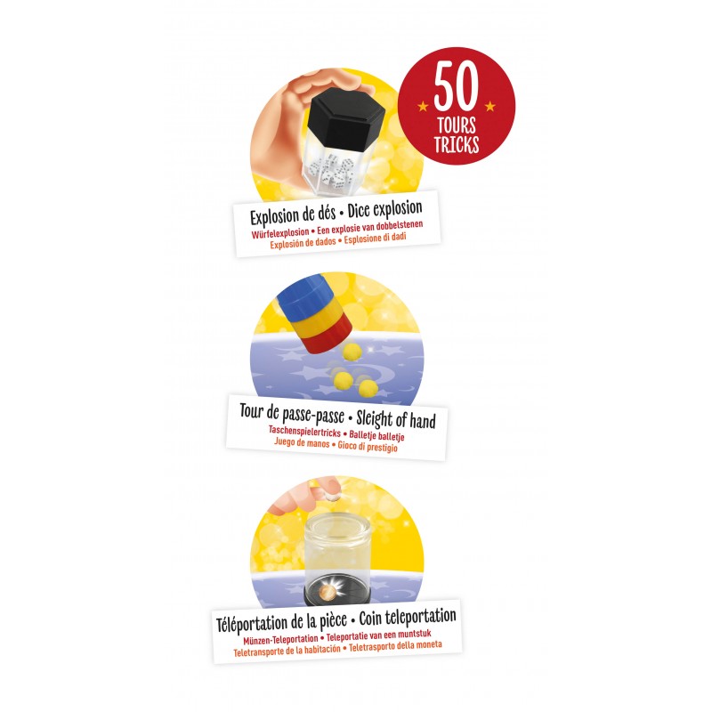 הערכה כוללת: אביזרי קסם עבור 50 טריקים שונים, כולל קסמי מנטליזם, קסמי קלוז-אפ וקלפים. המארז מכיל טריקים איקוניים כגון קוביית הנפץ וקסם הטלפורטציה.